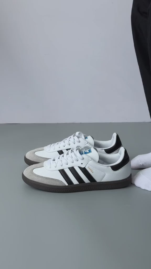 The SAMBA OG "White Black Gum" captures the essence of a vintage staple with sharp contrasts and timeless design. The clean white upper is accented by bold black side stripes and heel tab, while a cool grey toe cap and dark gum sole add a rugged edge to the silhouette. The pop of blue on the tongue label finishes the look with subtle character.